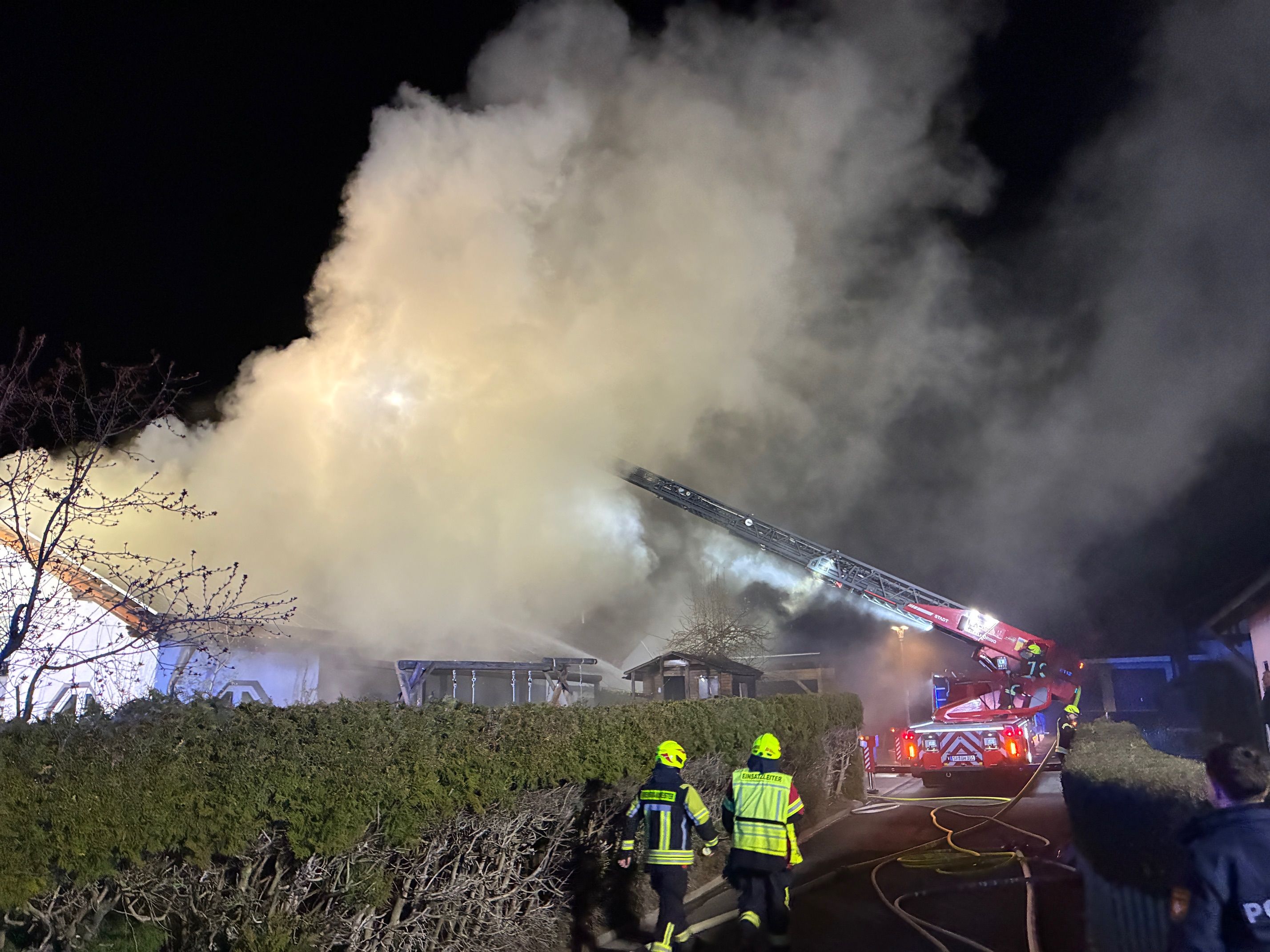 Sofort wurde ein Außenangriff durch das erste Löschfahrzeug eingeleitet und parallel die Drehleiter vorbereitet. Die umfangreichen Löscharbeiten konnten durch den dichten Rauch nur unter Atemschutz durchgeführt werden. Für die umfangreichen Löschmaßnahmen wurde im Verlauf eine zweite Drehleiter aus Mallersdorf und weitere Atemschutzgeräteträger aus Hainsbach und Perkam nachalarmiert.