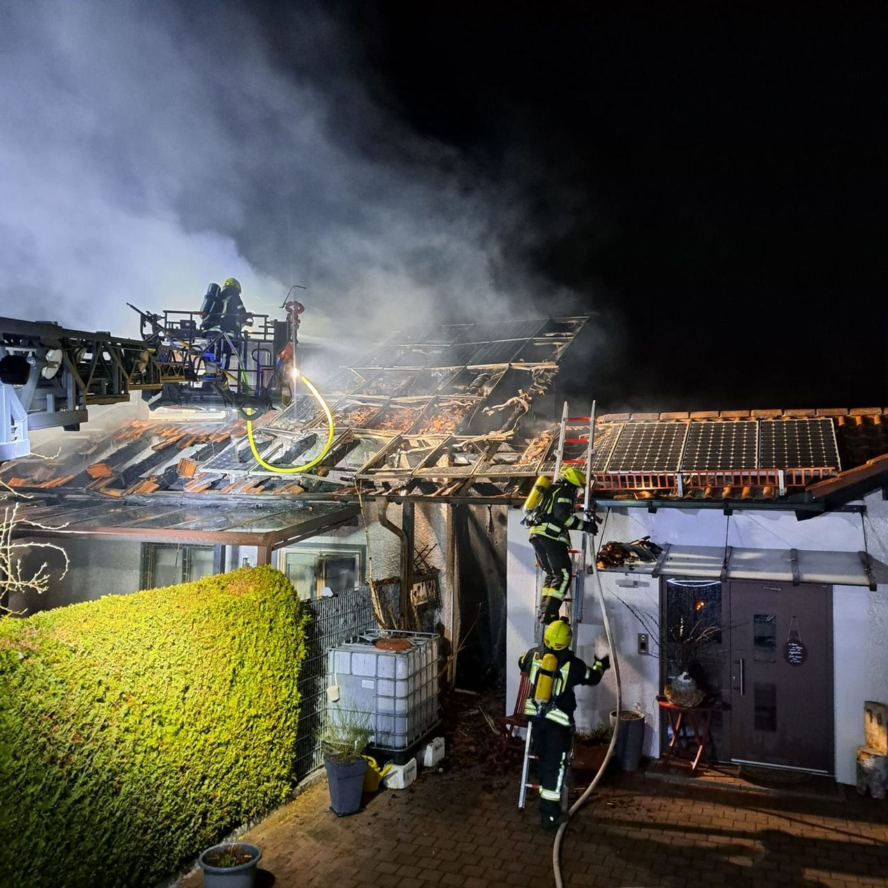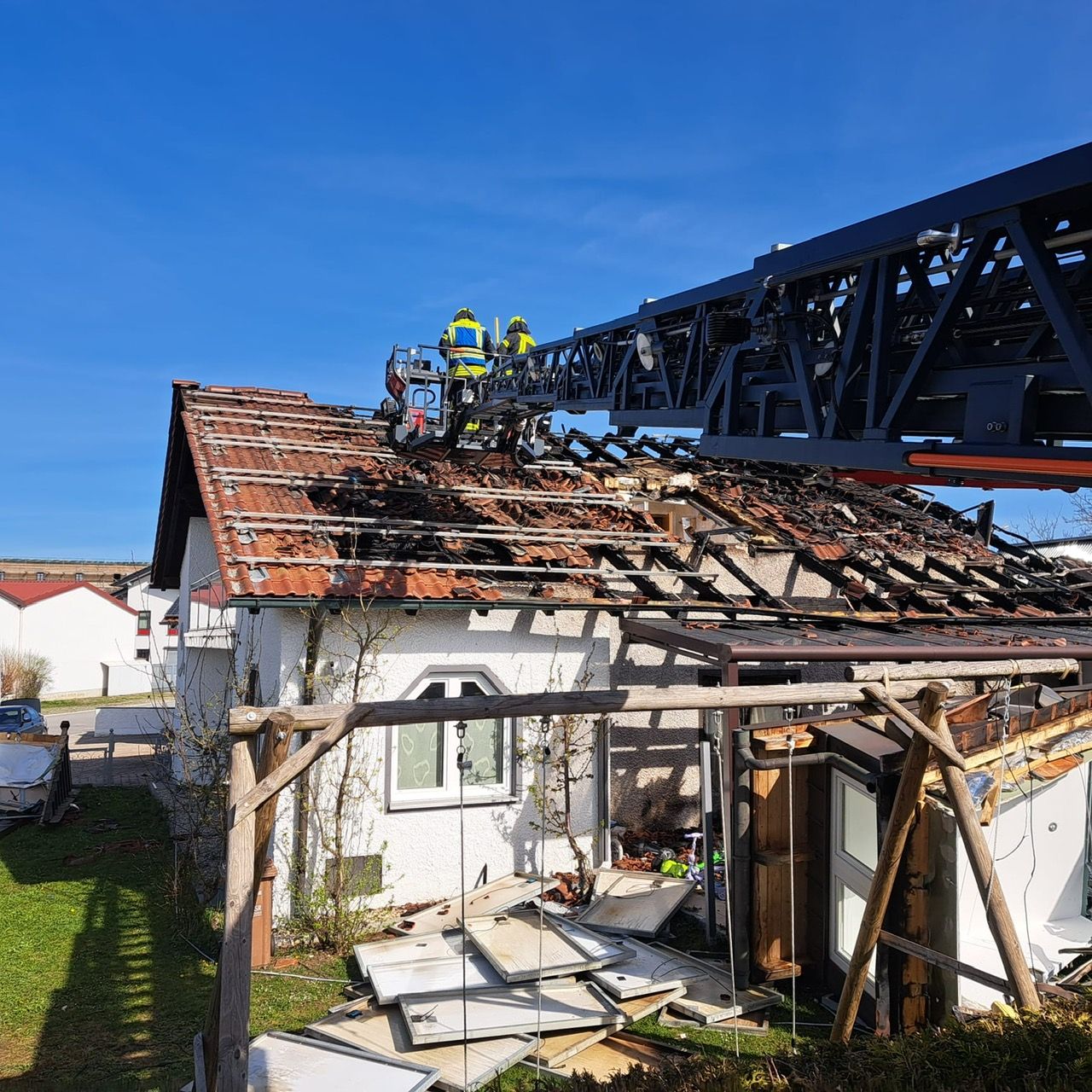 Nachdem das erste Feuer grob abgelöscht worden war, ging es an die aufwendigen Nachlöscharbeiten und das Auffinden versteckter Glutnester. Hierzu wurde von beiden Drehleiter die Photovoltaikanlage und die darunterliegende Dachhaut geöffnet. Immer wieder flammte es auf und dichter Rauch quoll aus dem offenen Dachstuhl. In regelmäßigen Abständen fanden mit der Einsatzleitung Lagebesprechung statt, um sich über das weitere Vorgehen abzustimmen. Am Vormittag konnten dann langsam erste Kräfte aus dem Einsatz herausgelöst werden.