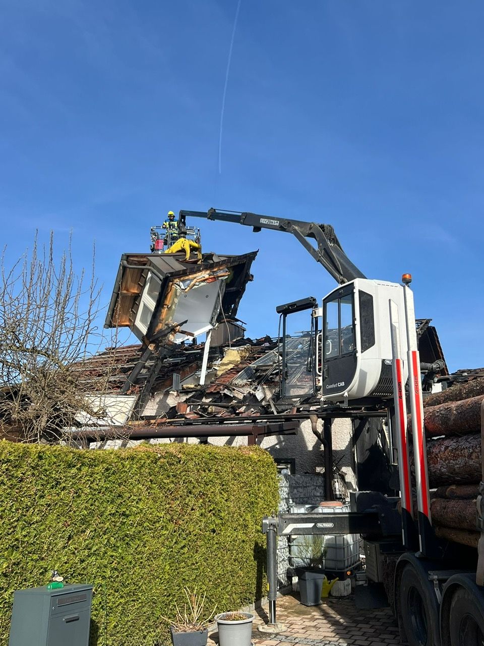 Mit Hilfe eines örtlichen Holztransportunternehmens und deren LKW-Ladekran wurden schlussendlich noch zwei Dachgauben entfernt. Insgesamt kamen bei dem siebenstündigen Einsatzes 24 Atemschutzgeräteträger zum Einsatz. Gegen Mittag konnte dann auch die Feuerwehr Geiselhöring die Einsatzstelle verlassen. Die Ermittlungen zur Brandursache wurden von der Polizei aufgenommen.
