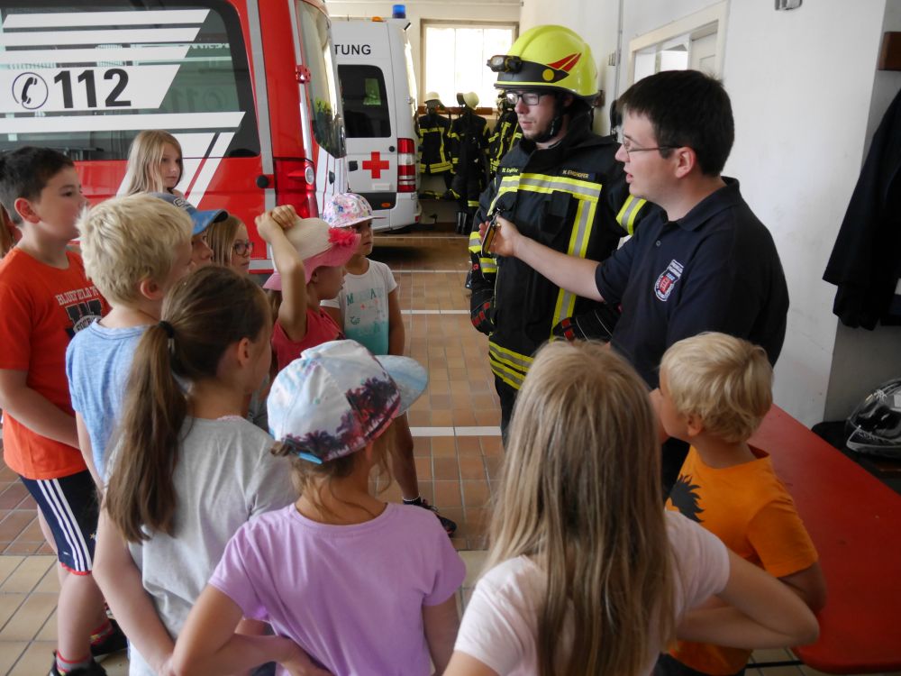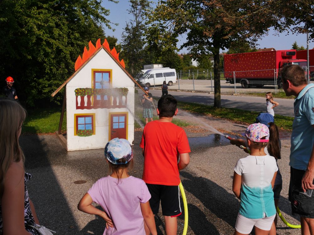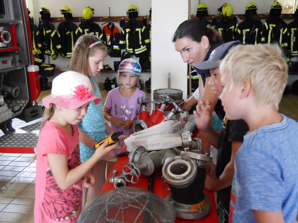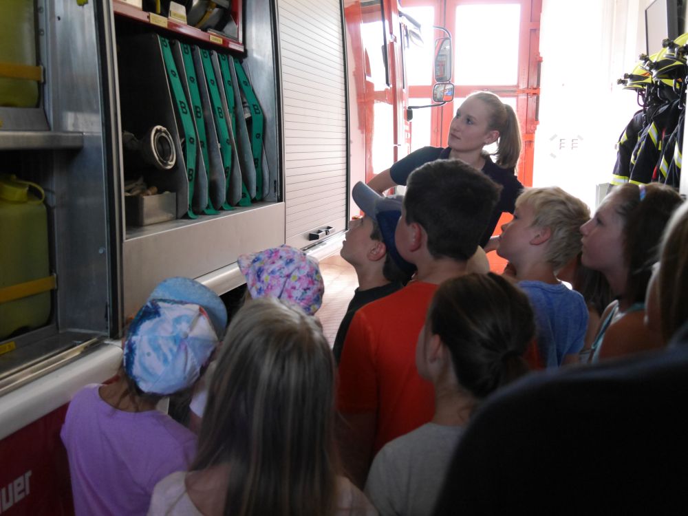Am Freitag, 25.08.2017, fand das diesjährige Ferienprogramm der Feuerwehr statt. Alles drehte sich um das Thema "Einsatz". Zuerst durften die Kinder hinter die Türen des Tanklöschfahrzeuges blicken. Ein Feuerwehrmann muss ja schließlich wissen wo die Geräte, die für den Einsatz notwendig sind, ihren Platz haben. Im Ernstfall muss es schnell gehen, auch beim Anziehen der Schutzkleidung, die sich die Kinder dann ganz genau anschauen durften. Im Einsatz unterhalten sich die Feuerwehrmänner per Funk was gleich an Hand eines Spieles getestet wurde. Nach sorgfältiger Vorbereitung und einer kleinen Stärkung hieß es dann "zum Einsatz fertig" und die Kinder durften ein Haus löschen.