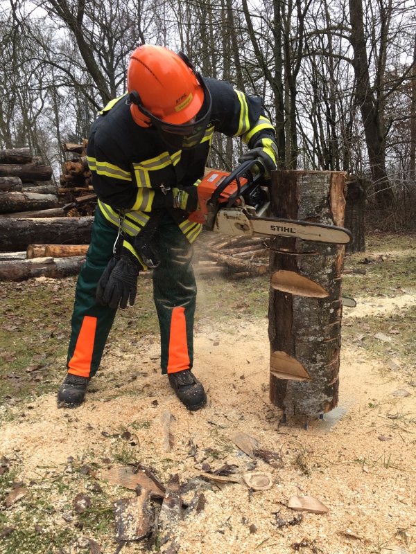 In der Theorie wurden hierbei die Grundkenntnisse über den Einsatz der Motorsäge vermittelt. Hierzu zählten die Unfallverhütungsvorschriften, verschiedene Schnitttechniken, Kettenkunde und die spezielle Schutzkleidung, welche beim Einsatz mit der Motorsäge zwingend vorgeschrieben ist.
